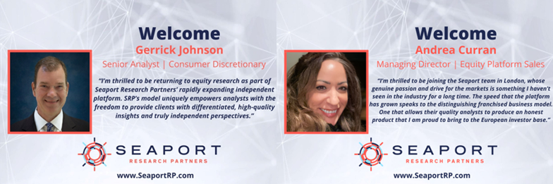 December 18, New York, NY – Seaport Research Partners (SRP), a rapidly expanding and innovative sell-side equity research platform, announced that Gerrick Johnson has joined the firm to bolster its Consumer offering, and Andrea Curran for U.S Equity Platform Sales.
